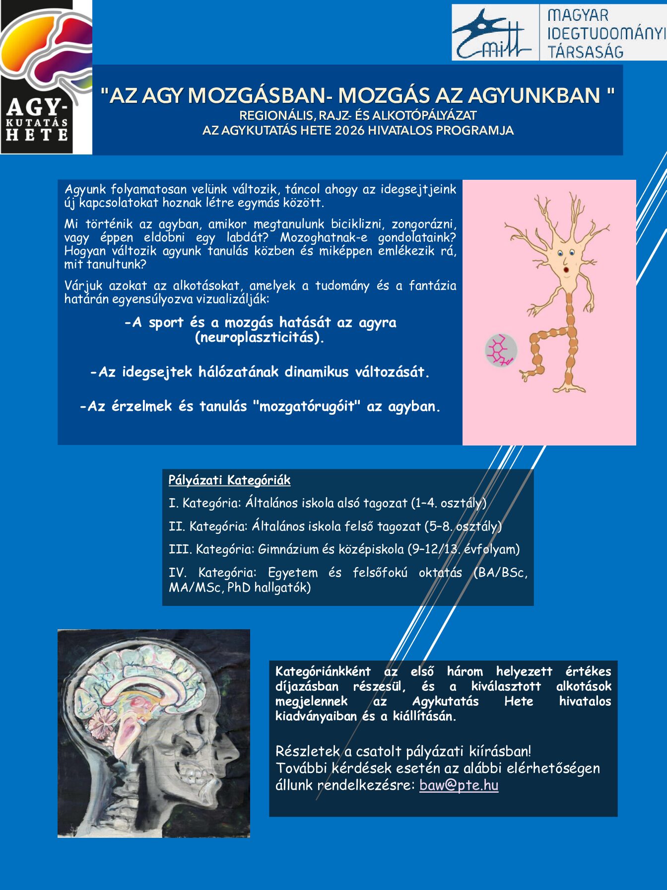 A Magyar Idegtudományi Társaság szakmai támogatásával meghirdeti a 2026-os év kiemelt művészeti és tudományos pályázatát diákok és hallgatók számára. Célunk, hogy a képzőművészet eszközeivel vizuálisan mutassuk be az emberi agy működésének dinamizmusát, a mozgás neurobiológiai csodáját, gondolatunk erejét.